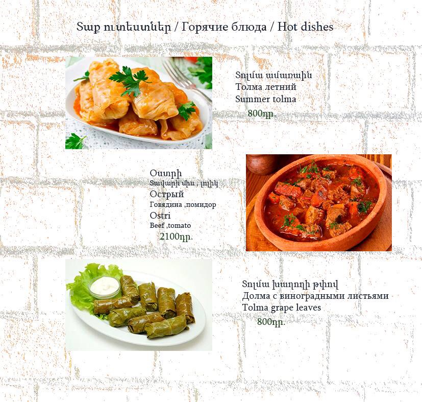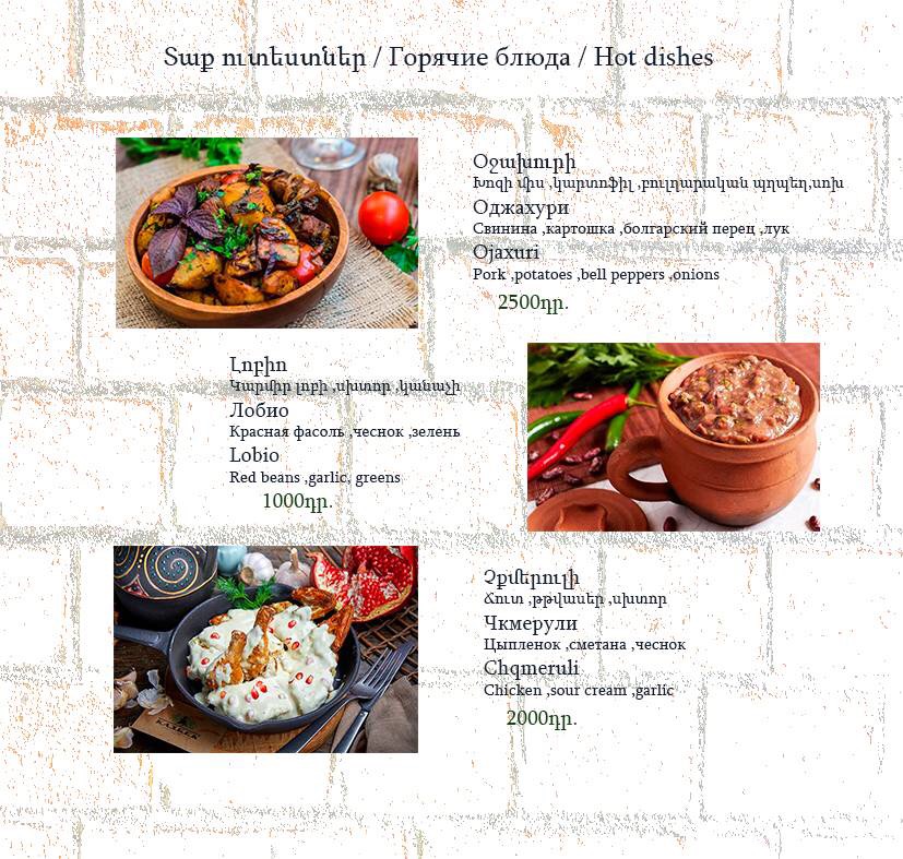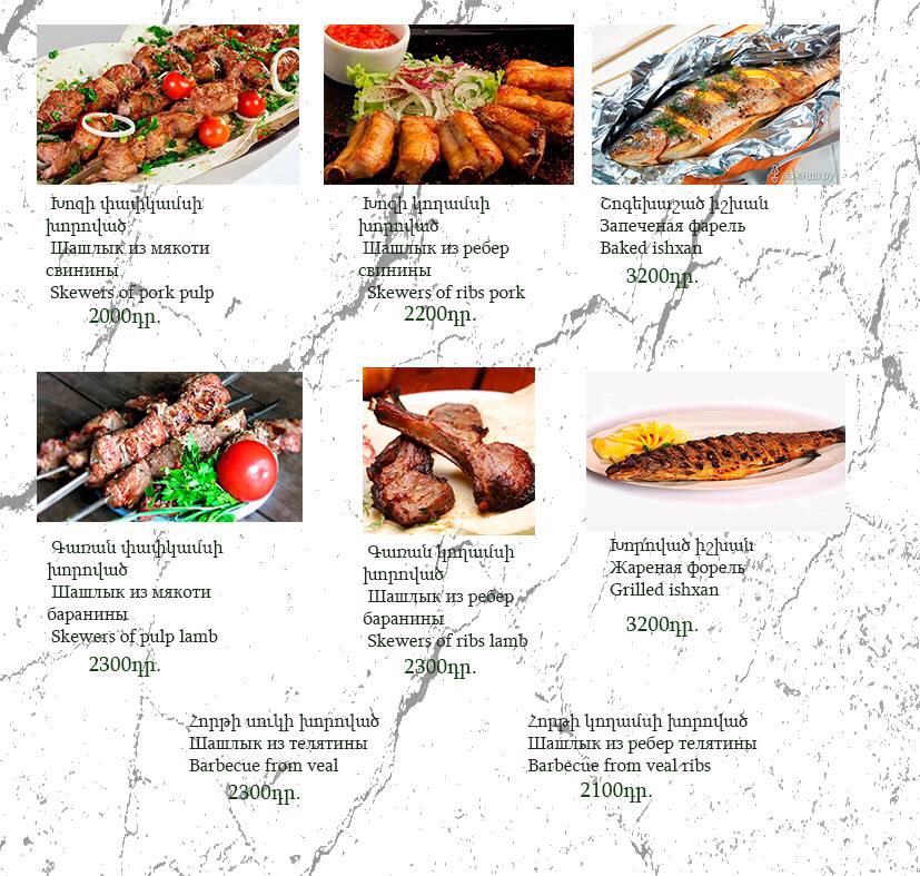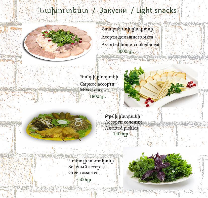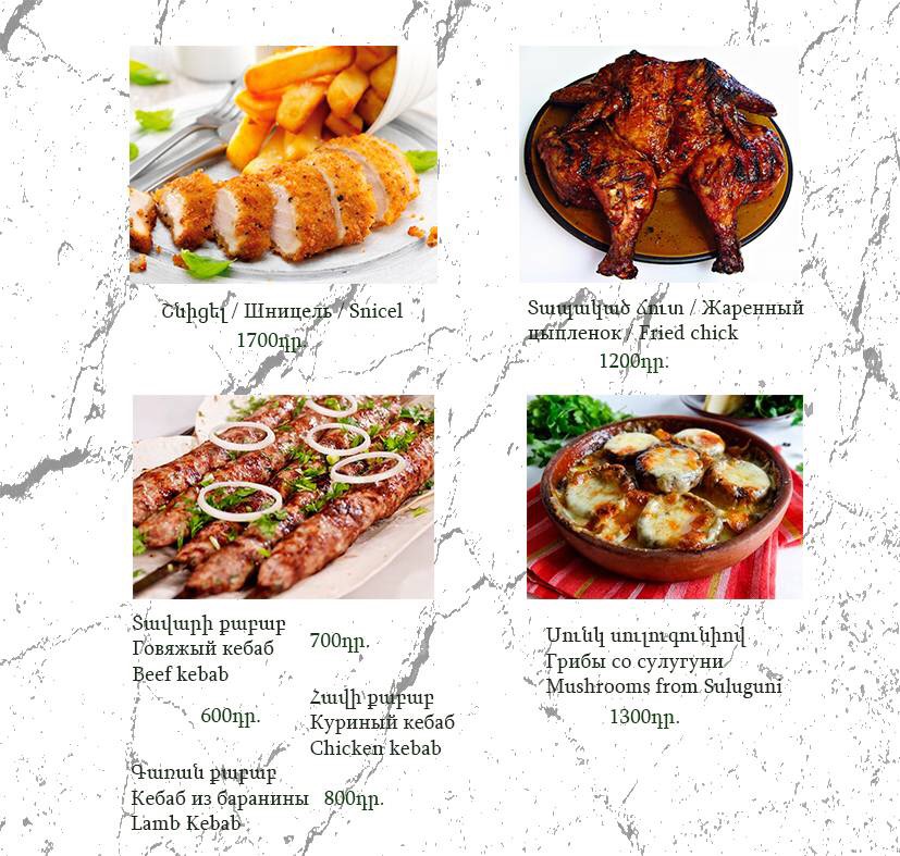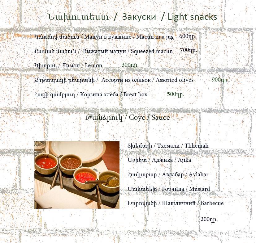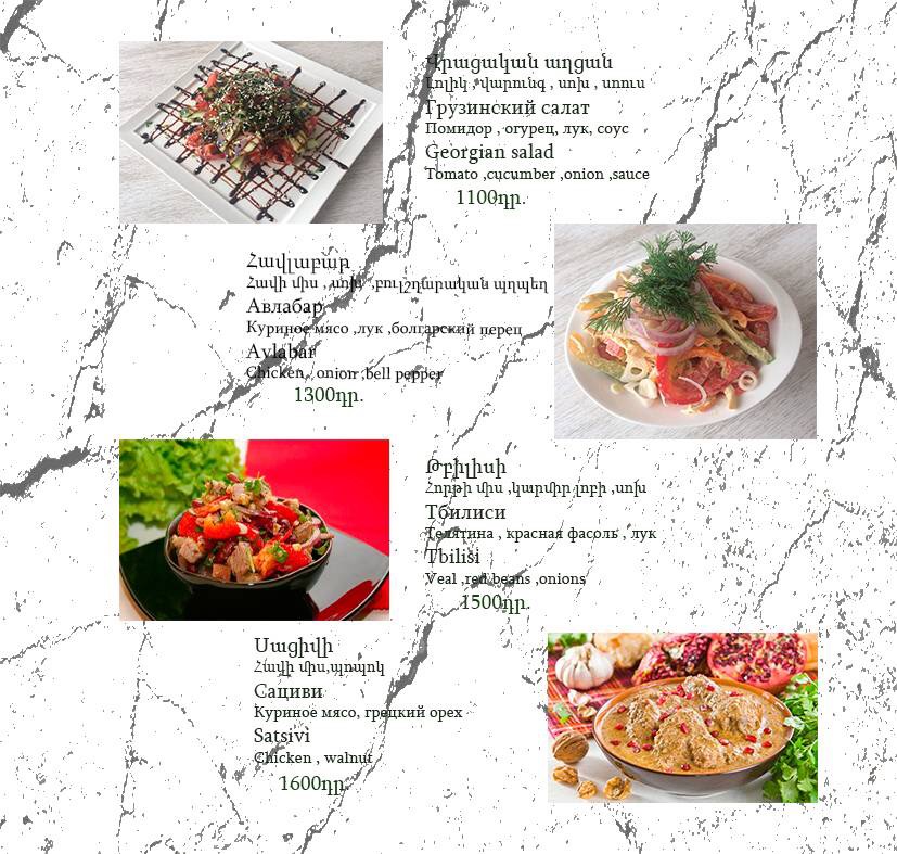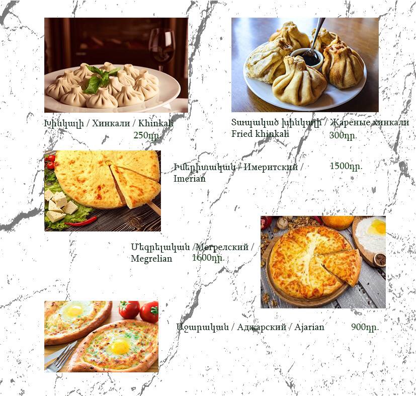 The menu at Havlabar Tavern in Gyumri reflects a clear focus on hearty local flavors balanced with simple, well-executed classics, creating a dining experience that feels both traditional and approachable. Staples like Dumpling and Khengali highlight the comfort-food side of the menu, offering filling, satisfying bites that emphasize texture and rich fillings. The presence of Pickles, Bread, and Armenian Greenery adds an authentic regional touch, acting as essential accompaniments that refresh the palate and round out heavier dishes. Lighter options such as Summer Salad provide contrast, making the menu feel complete rather than overly dense. For mains, Grilled Salmon stands out as a cleaner, more refined choice, while Home Made Sausage reinforces the tavern’s rustic identity with bold, savory character. Beverage options like Компот bring a traditional, homemade feel to the table, pairing naturally with the food, and finishing with Capuchino adds a familiar, comforting close to the meal. Taken together, the menu feels cohesive and thoughtfully curated, emphasizing recognizable dishes prepared in a straightforward manner, which suits the relaxed tavern atmosphere and leaves a clear impression of Gyumri’s local culinary spirit.
